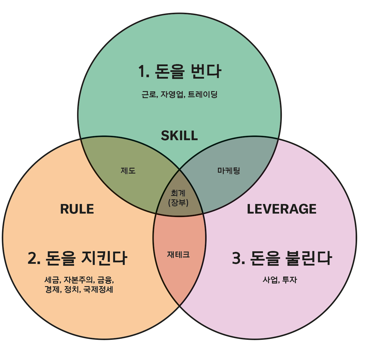 3. 돈을 불린다: 사업(사업은 내가 일을 안해도 잘 굴러가게 하는것), 투자가 이것에 속한다.
