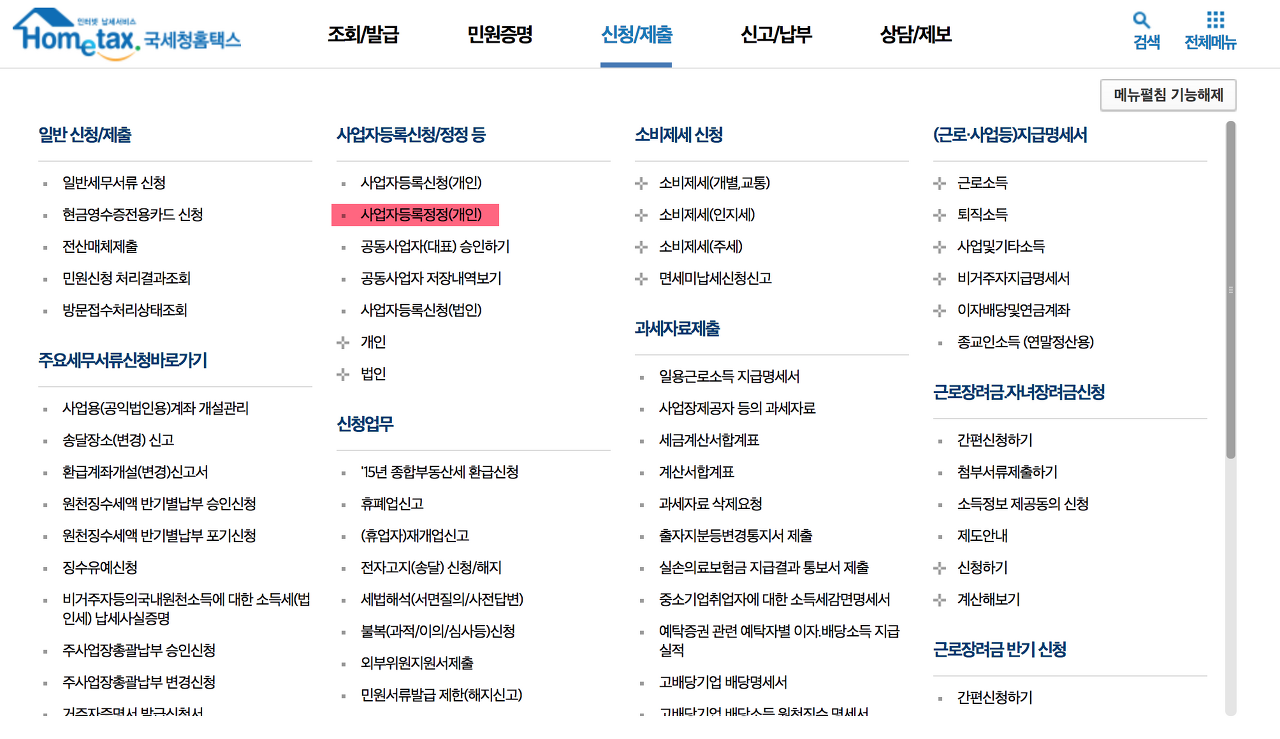 국세청 홈페이지에서 원래 가지고 있던 개인사업자 디테일로 로그인, 다시 다음 페이지에서 정정을 클릭하여 부업종을 추가신청한다.